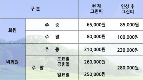 뉴코리아cc 그린피 인상 안내 페이지 정보 작성자 동부회원권거래소 작성일22-09-07 16:56 조회16,643회 댓글0건 관련링크 목록 본문 뉴코리아cc 그린피 인상 안내인상대상 : 회원 및 비회원인상시기 : 2022년 9월 1일부터 목록